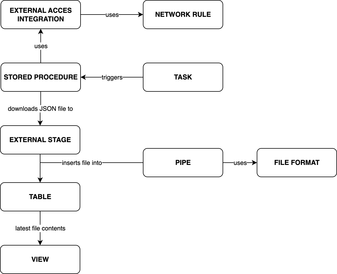 To do that, first, you need to create an egress network rule pointing to the Microsoft’s website addresses needed to reach and download the file. And, second, create an external access integration that will use those network rules to allow Snowflake outgoing traffic.